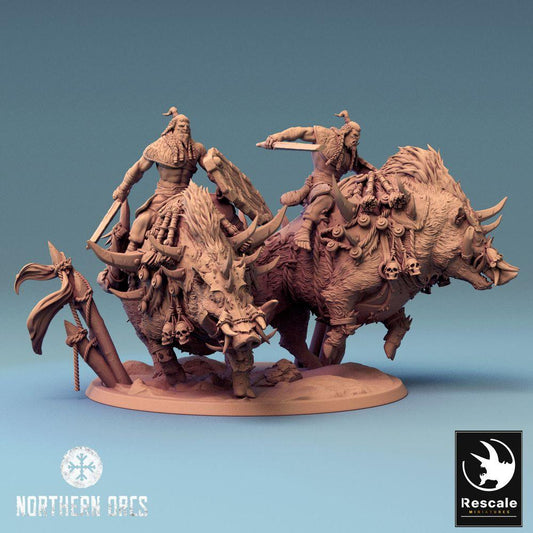 Tabletop Miniatur: Ork Wildschweinreiter Duo - Bestienreiter auf Kriegsebern, Ork Kavallerie, Orc Boar Riders (24_04_O)