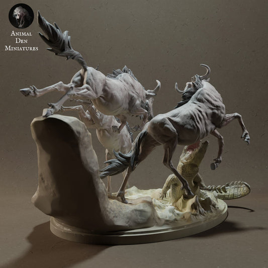 Savannní zvíře figurka: Gnu při přechodu řeky s nilským krokodýlem (Ref 01_01_41)