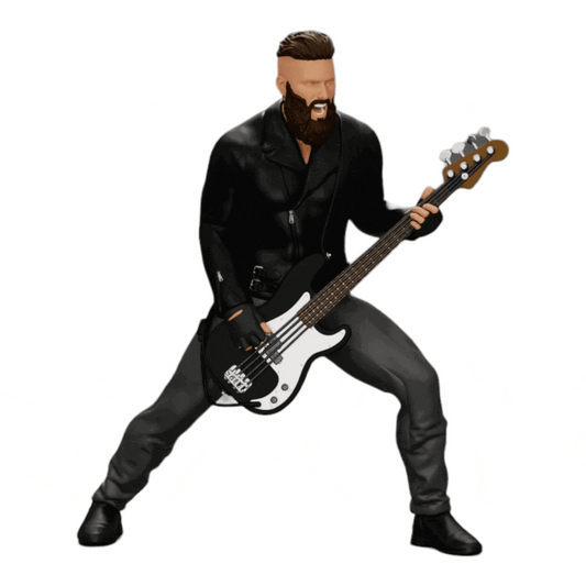 Miniature figure: Rockstar playing bass guitar in leather jacket with long hair and beard (No. a12)