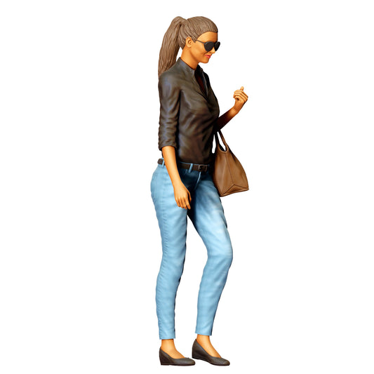 Kobieta w okularach przeciwsłonecznych i torebce – figura w dżinsach i skórzanej kurtce (Nr ref. 423)