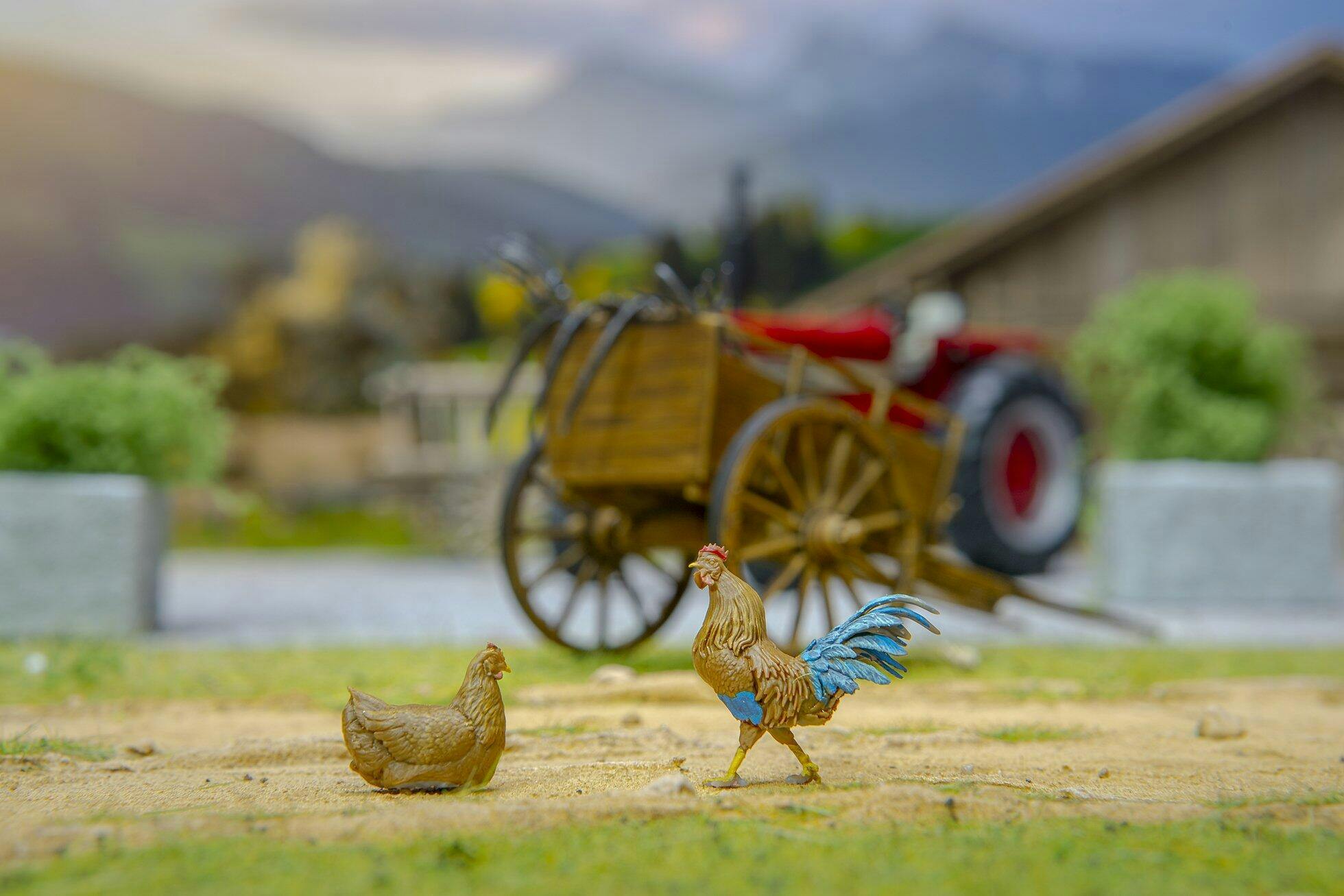Bauernhof Tier Figuren: 3 Hühner - essend, sitzend und laufend - 1:18