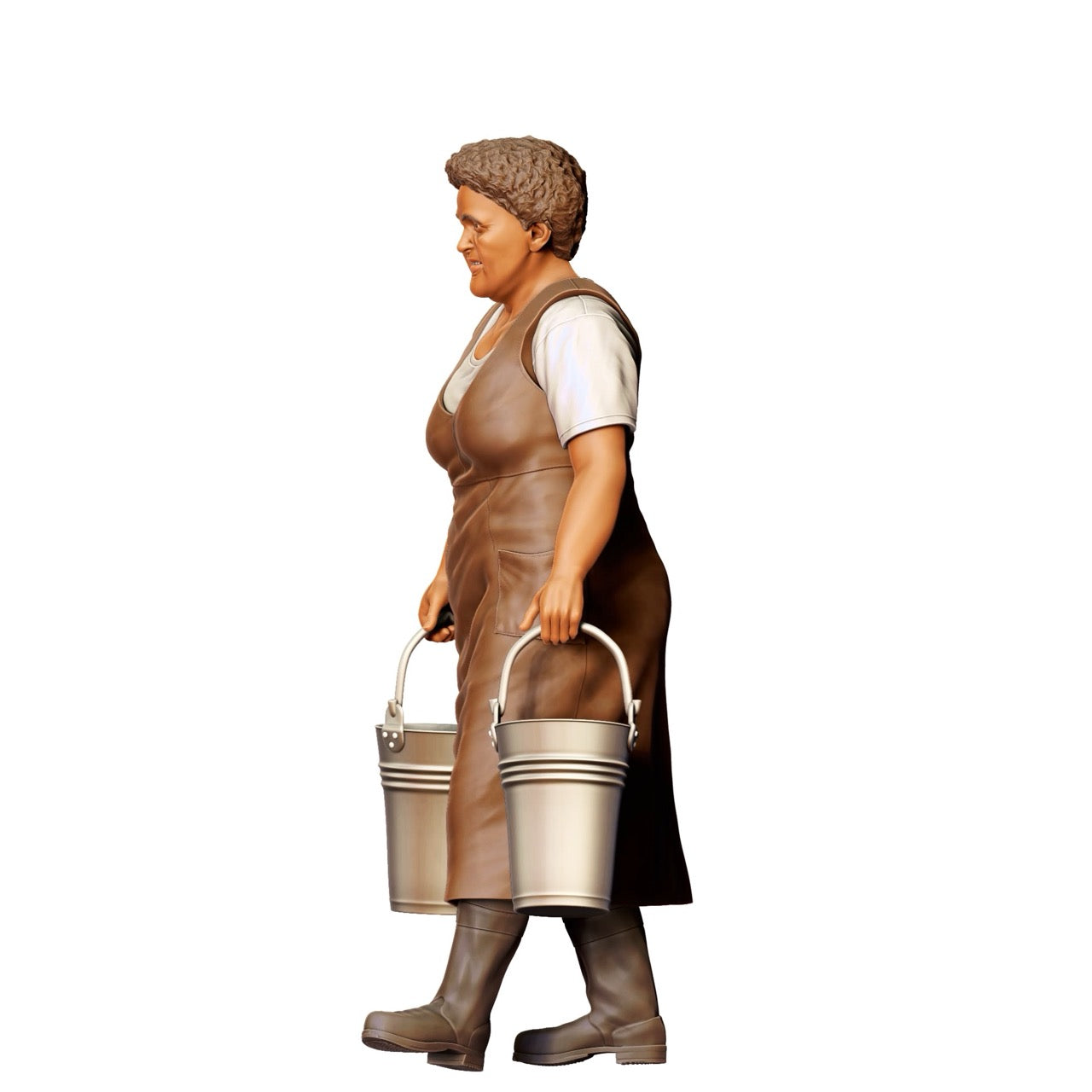 Ich habe diese Figur in Spur 1 (1:32) und Spur 0 (1:43) bemalt. Zeigt kein Model, sondern eine kräftige Landfrau, gut getroffen. Die Eimer kommen seperat, es empfiehlt sich die Henkel jedoch neu aus Draht zu erstellen.