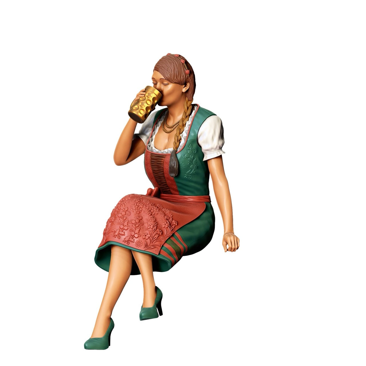 Miniatur Figur Oktoberfest: Wiesen Gäste: Sitzende Frau mit traditionellem Dirndl Outfit und Bier Krug (Nr. 291) - 1:20